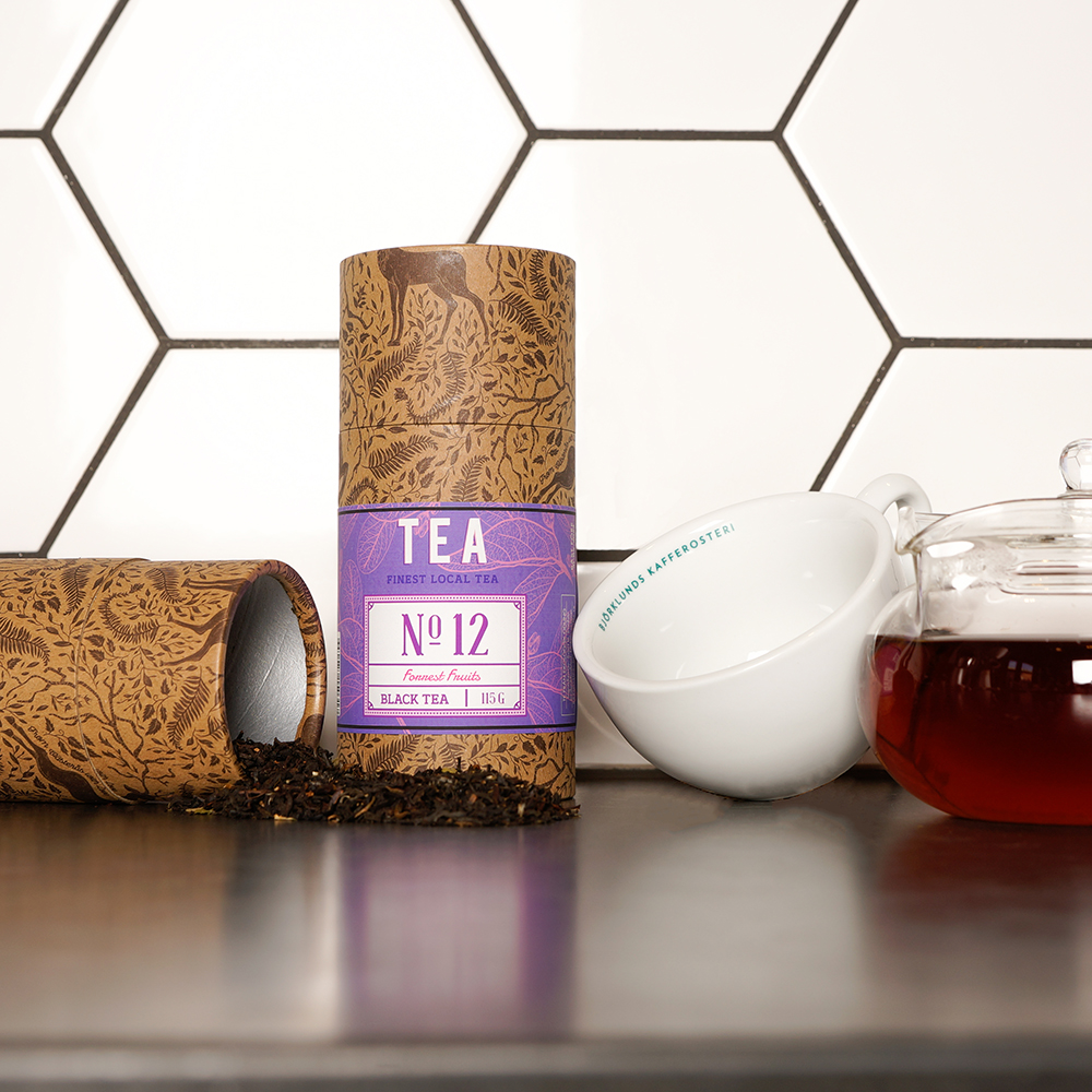 Svart te med söta mjuka toner av blåa och röda bär.