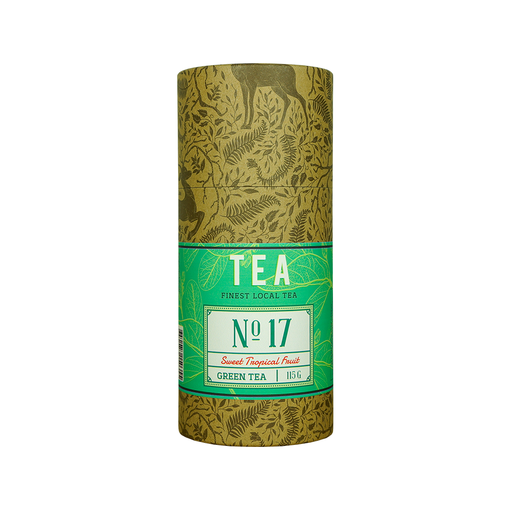 Grönt te med söta och varma toner av gul tropisk frukt och jordgubbar.
